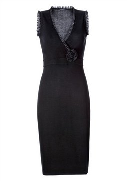 Элегантное женское, вязаное платье с плиссированными рюшами по краям. Цветочная апликация снимается. Длина ок. 98 см. 55% хлопок, 45% вискоза. Машинная стирка.