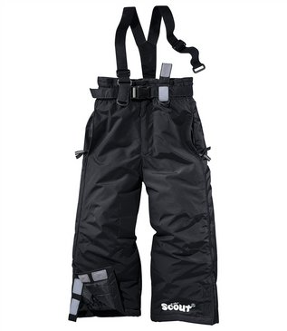 Детские теплые брюки. Практичная модель с регулируемыми съемными бретелями и эластичным поясом. Косые карманы на молнии. Разрезы сбоку на застежках-липучках, защита от ветра внизу брючин.