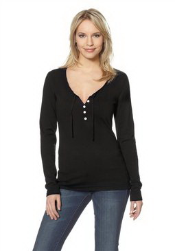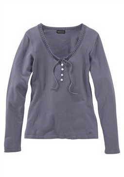 Женский пуловер. Вырез украшен кружевом, связанным крючком. Глубина выреза регулируется завязкой. Планка с пуговицами. Длина ок. 64 см. Приталенный покрой. 70% хлопок, 30% полиамид.