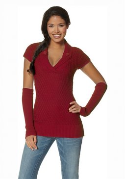 Женский комплект: пуловер с короткими рукавами и гетры для рук. Декоративный узор в виде косички, широкая окантовка, V-образный вырез с отворотом, украшенный пуговицами. Длина ок. 72 см. Покрой подчёркивает фигуру. 100 % хлопок.