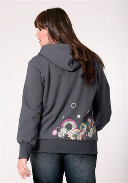 Женская толстовка с капюшоном и рисунком в азиатском стиле спереди и сзади. Внутренняя застёжка на молнию украшена красной лентой из бархата. Тканая декоративная завязка на плечах. Накладные карманы кенгуру спереди. Длина в зависимости от размера — от ок. 66 до 76 см. 100 % хлопок.