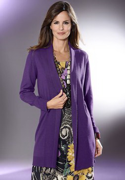 Стильная женская вязаная кофта. Ширина регулируется. Ребристые окончания в рукавах и кромке. Обигрывающая фигуру форма. Длина размера N — ок. 82 см. 100% полиакрил.