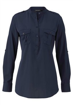 Женская блузка. Модный стиль милитари, с погонами и карманами с клапанами на груди. С воротником-стойкой и небольшой планкой застёжки на пуговицы. Длина ок. 70 см. Покрой красиво обыгрывает фигуру.