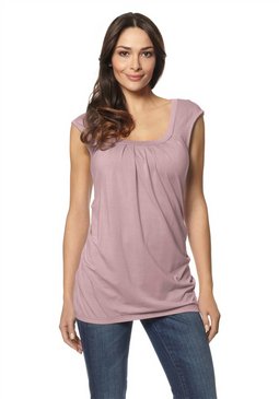 Стильная женская кофта. На широком круглом вырезе и в боковых швах заложены складки. Длина ок. 64 см. 95% вискоза, 5% эластан.