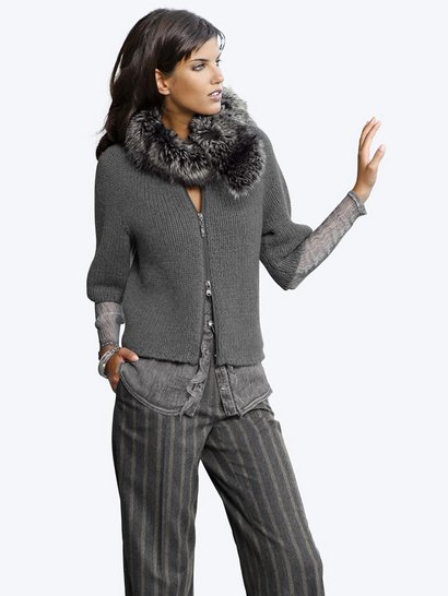 Женский кардиган прилегающего силуэта, на разъемной застежке-молнии с двумя бегунками, маленький воротник-стойка с вывязанной сборкой, удлиненный короткий рукав, длина разм. 38 ок. 52 см. Трикотаж из 90% натуральной шерсти, 10% кашемира. Рекомендуется ручная стирка.