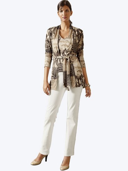 Женская кофта с эффектом запаха, Alba Moda. Прилегающий фасон с обозначенным запахом. Вместе с кофтой-кардиганом создают выразительный ансамбль-двойка. Длина разм. 38 ок. 64 см. Материал: 94% вискоза, 6% эластан. Машинная стирка.