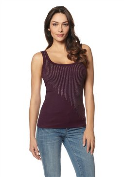 Стильный женский топ. Спереди эффектная отделка блестящими заклёпками. Длина ок. 64 см. Покрой великолепно подчёркивает фигуру. 50 % хлопок, 50 % вискоза.