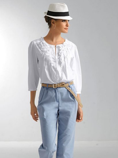 Женская блузка с рюшами, Alba Moda. Слегка расклешенный покрой, сзади кокетка, под кокеткой заложены легкие складки. Низ слегка закруглен, рукава длиной 3/4 с узкими манжетами и пуговицей. Мягкий материал из 100% хлопка. Длина ок. 66 см. Машинная стирка.