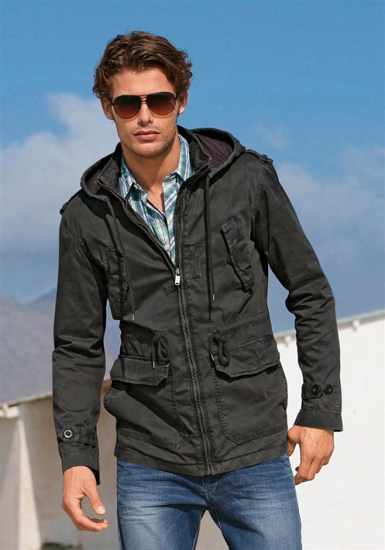 Мужская куртка, HILFIGER DENIM. С легким, очень ярким защитным рисунком тон в тон. Капюшон отстегивается. 2 больших кармана с клапанами с дополнительными боковыми входами. Два косых нагрудных кармана с клапаном. По талии кулиска. Хлястик на плечах и на окантовках рукавов. Маленький лейбл в виде флажка на левом рукаве. Длина по спинке разм. M ок. 80 см. Без подкладки. 100% хлопка.