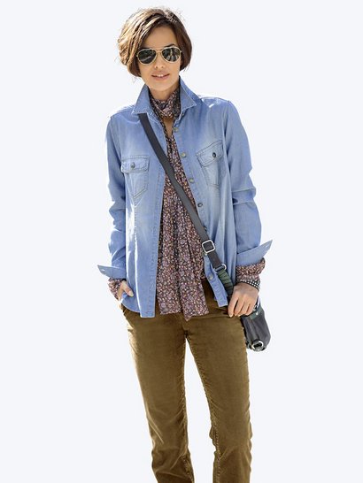 Женская джинсовая блузка, обработанная актуальной стиркой, от ALBA MODA RED – особая уникальная модель и базовый элемент для стильного лука. У джинсовой блузки нагрудные карманы с клапанами и декоративными пуговицами. Сзади на кокетке, рукава на манжете с 3-мя пуговицами. Модные разделительные рельефы спереди и на спинке, фигурная линия низа придают силуэту дополнительную стройность. Джинсовая блузка слегка приталенной формы с актуальными эффектами застиранности выполнена из традиционного денима (100% хлопок), модного и приятного при ношении. Длина разм. 38 ок. 60 см. Машинная стирка.