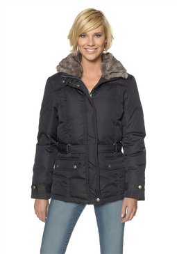 Женская пуховая куртка. Модные и практичные детали: съемные капюшон и воротник из искусственного меха, скрытая двусторонняя молния, планка с кнопками, регулируемый пояс, рукава с ригелями для регулирования ширины и вязаными манжетами для защиты от ветра. 2 кармана с клапанами, дополнительно внутренний карман на молнии. Длина ок. 68 см. Верх и подкладка: 100% полиэстер. Наполнитель: 50% пух, 50% перо. Искусственный мех: 85% полиакрил, 15% полиэстер.
