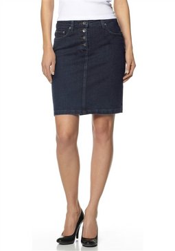 Стильная женская джинсовая юбка-стрейч с 5-ю классическими карманами. Декоративная планка с пуговицами. Сзади разрез и 2 накладных кармана с вышивкой. Длина ок. 50 см. Удобная посадка. 98% хлопок, 2% эластан.