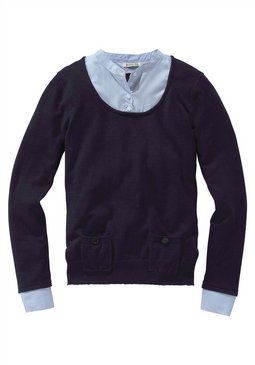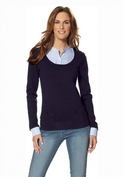 Модный женский пуловер. Эффект многослойности благодаря блузке-вставке с рисунком в полоску и настоящей планкой застёжки на пуговицы. Пуловер с круглым вырезом, 2 кармана на пуговицах. Окантовка в рубчик, вшитые манжеты блузки. Длина ок. 60 см. Очень узкий покрой. 70 % хлопок, 30 % полиамид. Блузка-вставка: 100 % хлопок.
