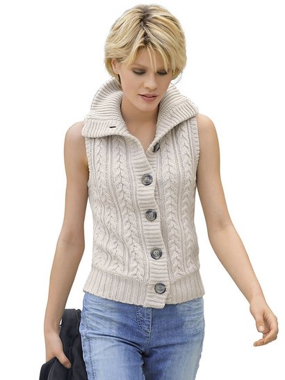 Женский вязаный жилет, Alba Moda в спортивном стиле прилегающего силуэта. Спортивный стиль отличает крупная вязка с традиционными косичками спереди и на спинке. Края обработаны вязкой в рубчик. Длина разм. 38 ок. 60 см. Полушерстяной трикотаж из 50% натуральной шерсти, 50% полиакрила. Рекомендуется деликатная стирка.