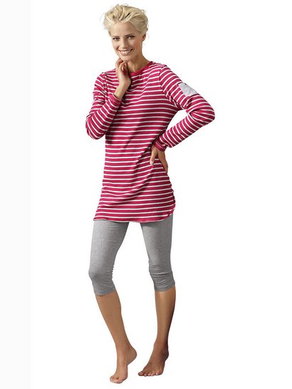 Женская пижама от SCHIESSER. Верх: красный лонгслив в белую поперечную полоску с боковыми шлицами. Прилегающего силуэта, длина разм. 38 ок. 78 см. Низ: облегающие фигуру серые леггинсы длиной 3/4 с поясом на резинке. Длина по внутреннему шву разм. 38 ок. 51 см. Материал: 100% хлопок. Машинная стирка.