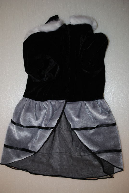 Вечернее платье для собаки. Очаровательный наряд для Вашего любимого питомца! Юбочка в полоску с бантиком, контрастная меховая опушка на воротничке. Застежка на кнопки. Длина по спинке ок. 29 см. Состав: полиэстер. Производство: Корея.