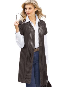 Стильная вязанная кофта с широкой ажурной планкой.Короткие рукава.Длина размера 42 ок. 82 см.100% полиакрил.