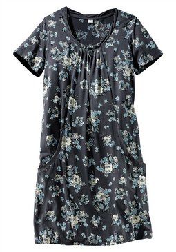 Женское платье с нежным цветочным рисунком. Складки на круглом вырезе. Косые карманы, эластичный низ. Длина в зависимости от размера от ок. 90 до 92 см. 50% хлопок, 50% модал.