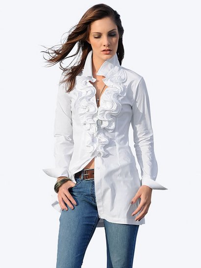 Женская длинная белая блузка с рюшами от Alba Moda – must have нового модного сезона. Изысканная и неповторимая блузка с рюшами сделает ваш имидж идеальным и неповторимым. Блузка поражает своим неподражаемым качествами при ее ношении. Повышенный комфорт в носке достигается благодаря специально нацеленной на удобство композиции разных материалов из вискозного джерси и поплина. Спинка выполнена из эластичного джерси, полочки из стрейч-поплина. Таким образом, блузка повторяет каждое ваше движение и вам самой просто не захочется ее снимать! Блузка очаровывает своей дизайнерской отделкой из декоративных рюшей вдоль планки застежки, рубашечному воротнику и длинным рукавам. Узкого приталенного силуэта, длина разм. 38 ок. 76 см. Исключительно приятный в носке стрейч-материал джерси из 95% вискозы, 5% эластана и стрейч-поплин из 96% хлопка, 4% эластана. Машинная стирка.