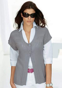 Стильный женский кардиган вязаный. Изысканный ажурный узор спереди, по краям широкая кайма в рубчик. Застежка на 2 пуговицы. Длина разм. 42 ок. 66 см. Покрой подчеркивает фигуру. 55% хлопок, 45% вискоза.