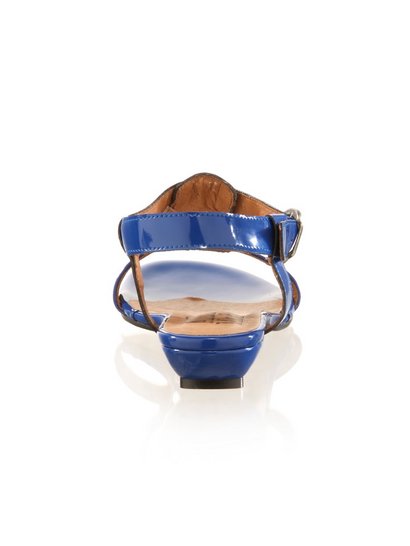 Лаковые сандалеты из высококачественного лакированного искусственного материала. Декорированы металлическим элементом цвета старинного серебра. Смягченная кожаная стелька, высота каблука ок. 2 см.