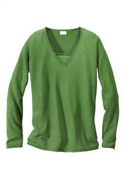 Пуловер женский. На V-образном вырезе вставка в тон. Модные закатанные края. Длина в зависимости от размера от ок. 66 до 76 см.
