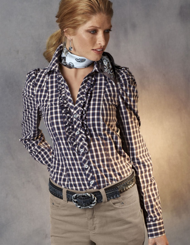 Стильная женская блузка-рубашка из натурального хлопка в клетку. С эффектно собранными рукавами-фонариками и рюшей вдоль застежки на пуговицы. Длина около 62 см.