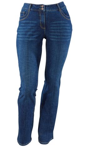 Плотная структура ткани. С эффектом ношености. Длина по внутреннему шву ок. 82 см. 98% хлопок, 2% эластан.