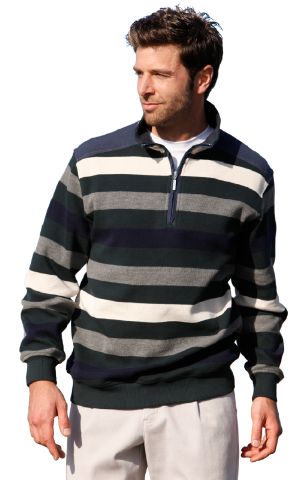 Стильная мужская кофта с длинными рукавами. Вырез горловины с застежкой молния. Рисунок в полоску. Эластчиные манжеты рукавов и кромка изделия. Длина ок. 72-80 см. 85% хлопок, 15% полиэстер.