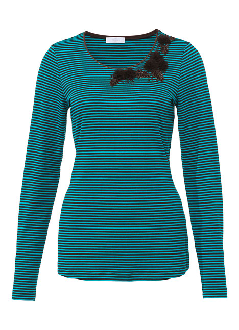 Кофта женская в тонкую полоску, Elegance. Бисер, пайетки и пушистые аппликации украшают кофту с изящным шармом. Длина ок. 62 см. Машинная стирка. 65% вискозы, 30% полиэстера, 5% эластана.