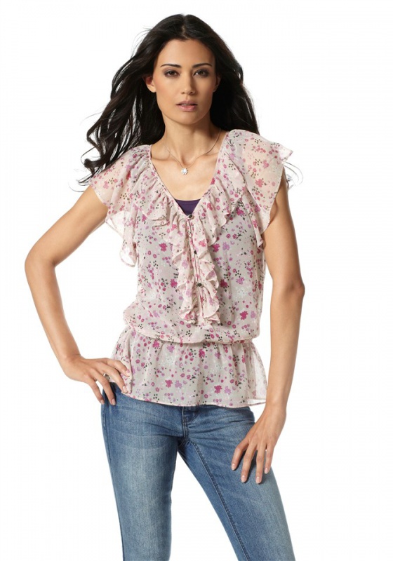 Очаровательная и при этом очень женственная блузка со сплошным рисунком в цветочек из полупрозрачного материала. V-образный вырез, декоративная оборка на планке застёжки на пуговицы. Резинка на уровне бедер гарантирует идеальную посадку по фигуре. Широкие рукава «крылышки». Длина ок. 64 см. Покрой отлично подчёркивает фигуру. Шифон из 100 % полиэстера.