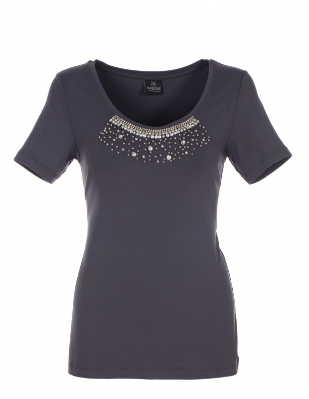 Элегантная женская кофта с круглым вырезом и короткими рукавами. Подчеркивающий фигуру покрой. Круглый вырез украшен оригинальной декоративной фурнитурой. Из мягкой и шелковистой вискозы. Длина около 58 см. Состав: 95% вискоза, 5% эластан.