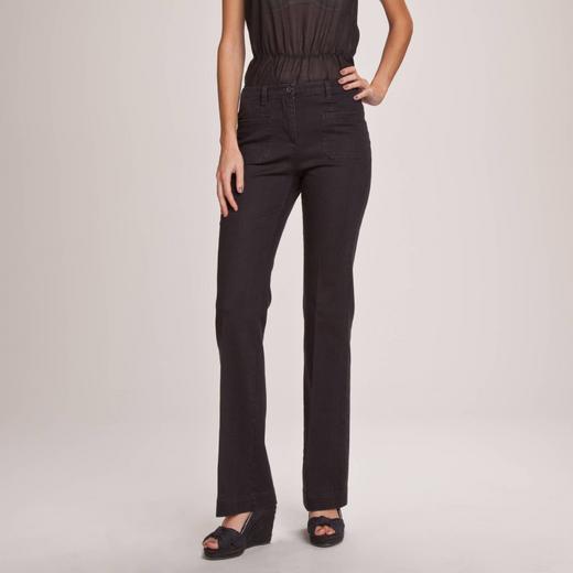 Элегантные женские брюки с высокой талией. Пояс со шлевками. Крой прямой, слегка расширяющийся к низу. Стрелки спереди. Застёжка на пуговицу и молнию. 2 накладных кармана спереди и сзади. Длина шагового шва ок. 86 см. Ширина низа ок. 26 см. 98% хлопок, 2% эластан