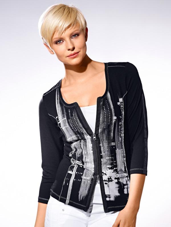Стильная женская кофта с двусторонней молнией. Круглый вырез горловины, рукава длиной 3/4. Декоративные швы спереди и сзади. Эффектный рисунок спереди. Длина ок. 60 см. Состав: 92% вискозы и 8% эластан.
