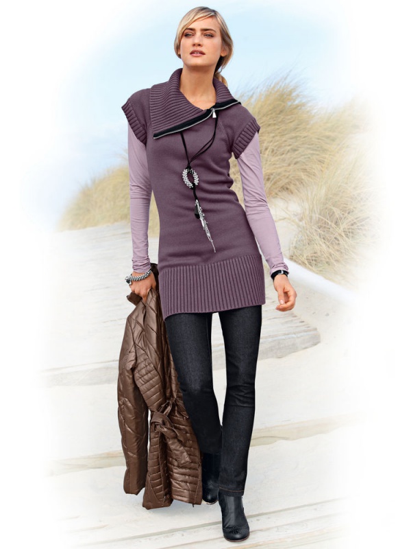 Модный длинный пуловер с коротким рукавом. Широкий воротник с боку застегивается на молнию. Обтягивающей формы. Длина ок. 76 см. 92% хлопок, 8% полиамид.