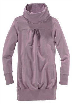 Женская удлиненная кофта с воротником-гольф. Сбоку карман, широкий низ на кнопках. Длина ок. 82 см. Подчеркивающий фигуру покрой.