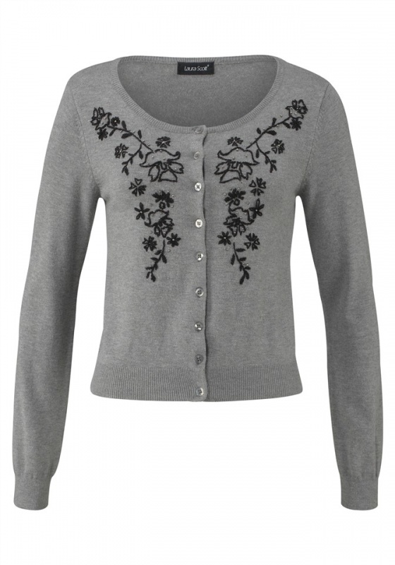 С вышивкой спереди и отделкой декоративными жемчужинами. С блестящими декоративными пуговицами. Окантовка в рубчик. Длина ок. 52 см. Покрой великолепно подчёркивает фигуру. Мягкий, тонкий трикотаж из 70 % вискозы, 30 % полиамида.