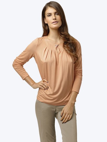 Женская кофточка из мягкого, легкого трикотажа с эффектными сборками спереди и маленькой пряжкой из стразов на вырезе - капелька. Женственный силуэт, длина разм. 38 ок. 60 см. Ласково прилегающий материал из 92% вискозы, 8% эластана. Машинная стирка.