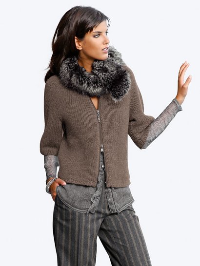 Женский кардиган прилегающего силуэта, на разъемной застежке-молнии с двумя бегунками, маленький воротник-стойка с вывязанной сборкой, удлиненный короткий рукав, длина разм. 38 ок. 52 см. Трикотаж из 90% натуральной шерсти, 10% кашемира. Рекомендуется ручная стирка.