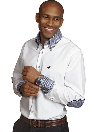 Мужская рубашка, Culture. Модная посадка с высоким воротником, с пристегивающимися на пуговицы кончиками и отделками на локтях. Воротник, манжеты и отделки на локтях из материала в клетку. Красивая вышивка, формирующие фигуру вытачки на спинке. Длина по спинке ок. 79 см. 100% хлопка. Машинная стирка.