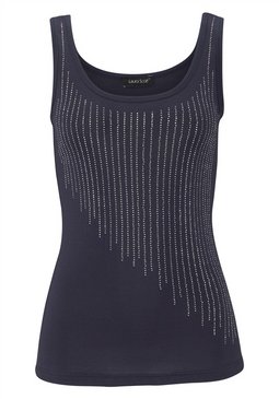 Стильный женский топ. Спереди эффектная отделка блестящими заклёпками. Длина ок. 64 см. Покрой великолепно подчёркивает фигуру. 50 % хлопок, 50 % вискоза.