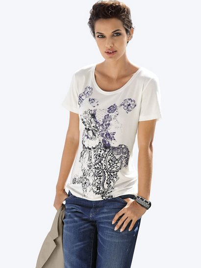 Женская футболка с кружевным принтом, Alba Moda. Прилегающей формы, длина разм. 38 ок. 64 см. Материал: 93% вискоза, 7% эластан. Машинная стирка.