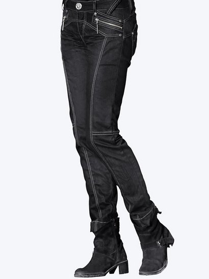 Женские джинсы спереди и сзади с красиво выполненной кокеткой, двумя передними карманами на молнии и декоративными заклепками и двумя задними карманами, декоративно оформленными строчкой-вышивкой и заклепками. Джинсы плотно прилегают по всей длине, следуя изгибам фигуры, книзу заужены. Пояс со шлевками для ремня, слегка заниженная высота талии. Длина по внутреннему шву размера 38 ок. 81 см, ширина внизу ок. 29 см. Материал стрейч из 98% хлопка, 2% эластана. Машинная стирка.