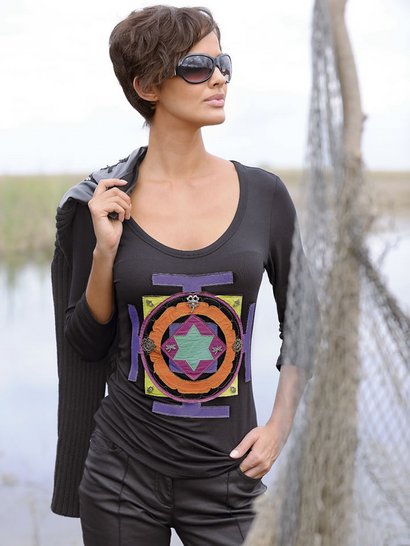 Женская кофта, Alba Moda. Спереди роскошный пэтчворк и отделка маленькими камешками. Рукава длиной 3/4. Подчеркивающий фигуру покрой. Длина ок. 64 см. 95% вискозы, 5% эластана. машинная стирка.