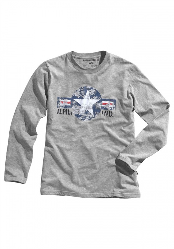 Мужская футболка с длинными рукавами, ALPHA. С круглым вырезом горловины и цветным рисунком спереди. Серый меланж: 95% хлопка, 5% полиэстера. 100% хлопка.