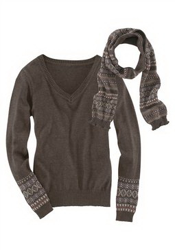 Женский комплект: пуловер+шарф. Роскошный жаккардовый трикотаж с узором в норвежском стиле на рукавах. V-образный вырез и окантовка в рубчик. Длина ок. 64 см. Очень узкий покрой. Шарф: одна сторона с норвежским узором, а другая — однотонная. Длиной ок. 185 см. 50 % хлопок, 50 % полиакрил.