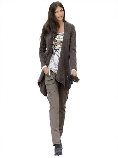 Женские брюки-карго из легкой и эластичной ткани очень мягкой на ощупь. Спереди большие накладные карманы с наклонно вставленными молниями и маленький карманчик в рамочку с клапаном и скрытой кнопкой. Сбоку накладные карго-карманы с клапаном и скрытой кнопкой. Сзади кокетка, два накладных кармана с клапаном и скрытой кнопкой, а также модные разделительные швы. Подчеркивающая фигуру форма узкого силуэта, брюки книзу плавно заужены. Пояс с петлями для ремня, несколько заниженная высота талии. Ширина брюк внизу ок. 36 см, длина по внутреннему шву разм. 38 ок. 77,5 см. приятный в носке материал из 97% хлопка, 3% эластана. Машинная стирка.