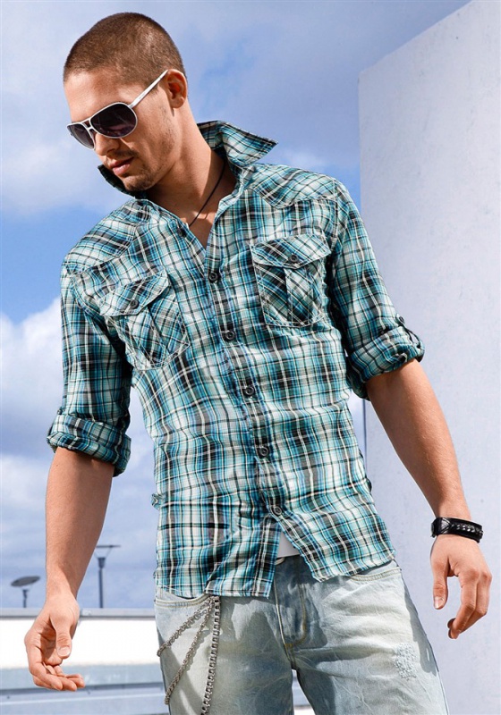 Стильная мужская рубашка. Рисунок в клетку, застёжки для подкатывания рукавов. Узкий покрой. 100% хлопка.