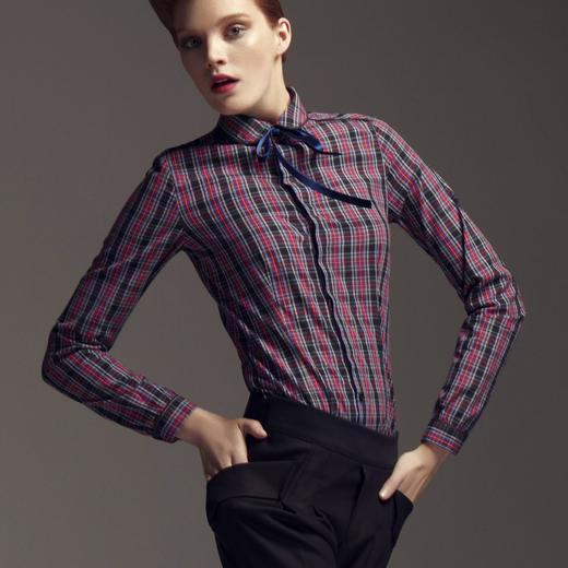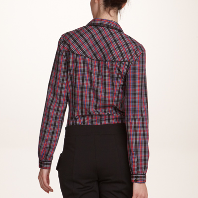 Яркая женская рубашка в клетку. Круглый отложной воротник. Отделка контрастным кантом черного цвета. Нижний край слегка закруглен. Длина ок. 67 см. 100% хлопок.