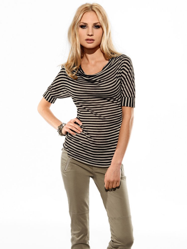 Женская кофта в полоску, Heine. То, что нужно для модниц! Красивая деталь: маленькие включенные цветовые пигменты. Слегка приталенного покроя, с выполненным воротником «водопад». Короткие рукава. Длина ок. 64 см. Подчеркивающий фигуру покрой. 93% вискозы, 5% шерсти, 2% эластана. Машинная стирка.